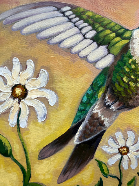 “Ruby and the Daisies” is an original oil painting that captures a quiet summer moment. A ruby-throated hummingbird spreads his wings, fluttering gently around blooming daisies in the warmth of the sun.